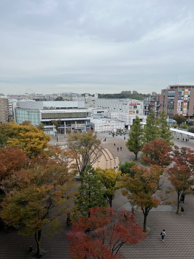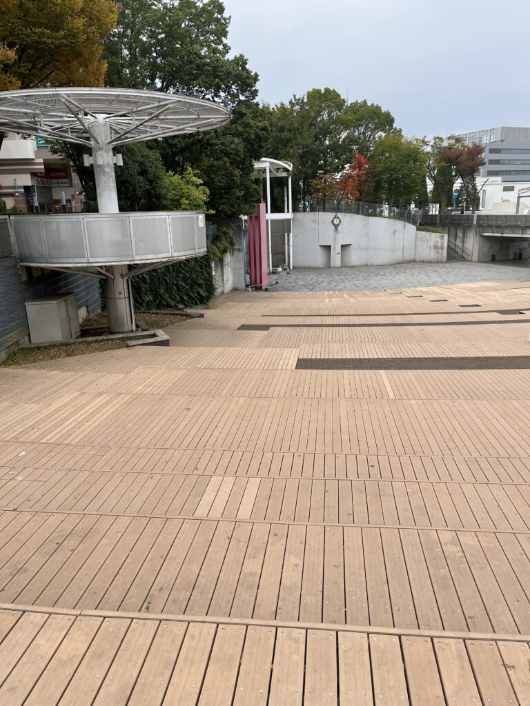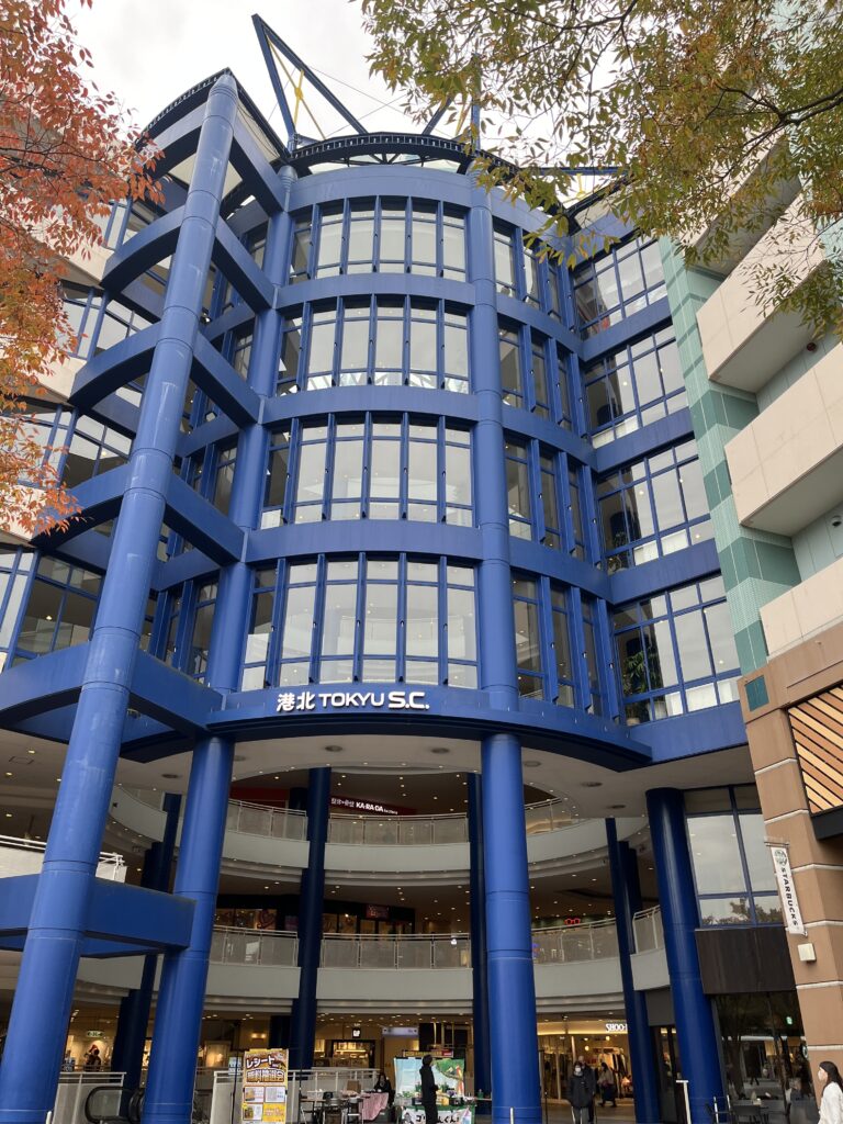 広場の中央にはベンチ、正面には「港北 TOKYU S.C.」。